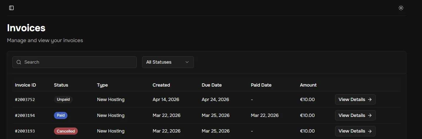 - Unpaid – marked with a red “Unpaid” status. To pay: click “View details,” select a payment method (bank card or cryptocurrency), and click “Pay now.”
