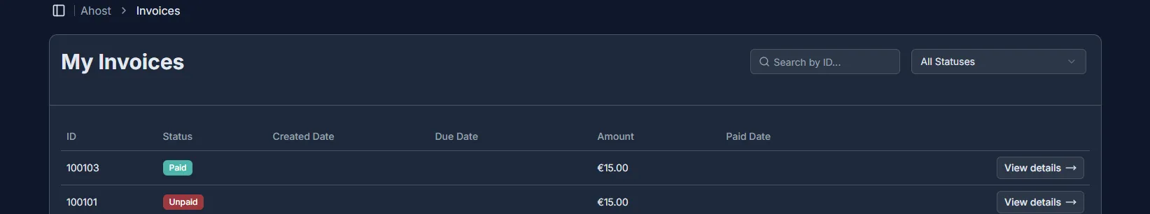 - Paid – marked with a green “Paid” status; the invoice details show the order summary, amount, and payment date.
