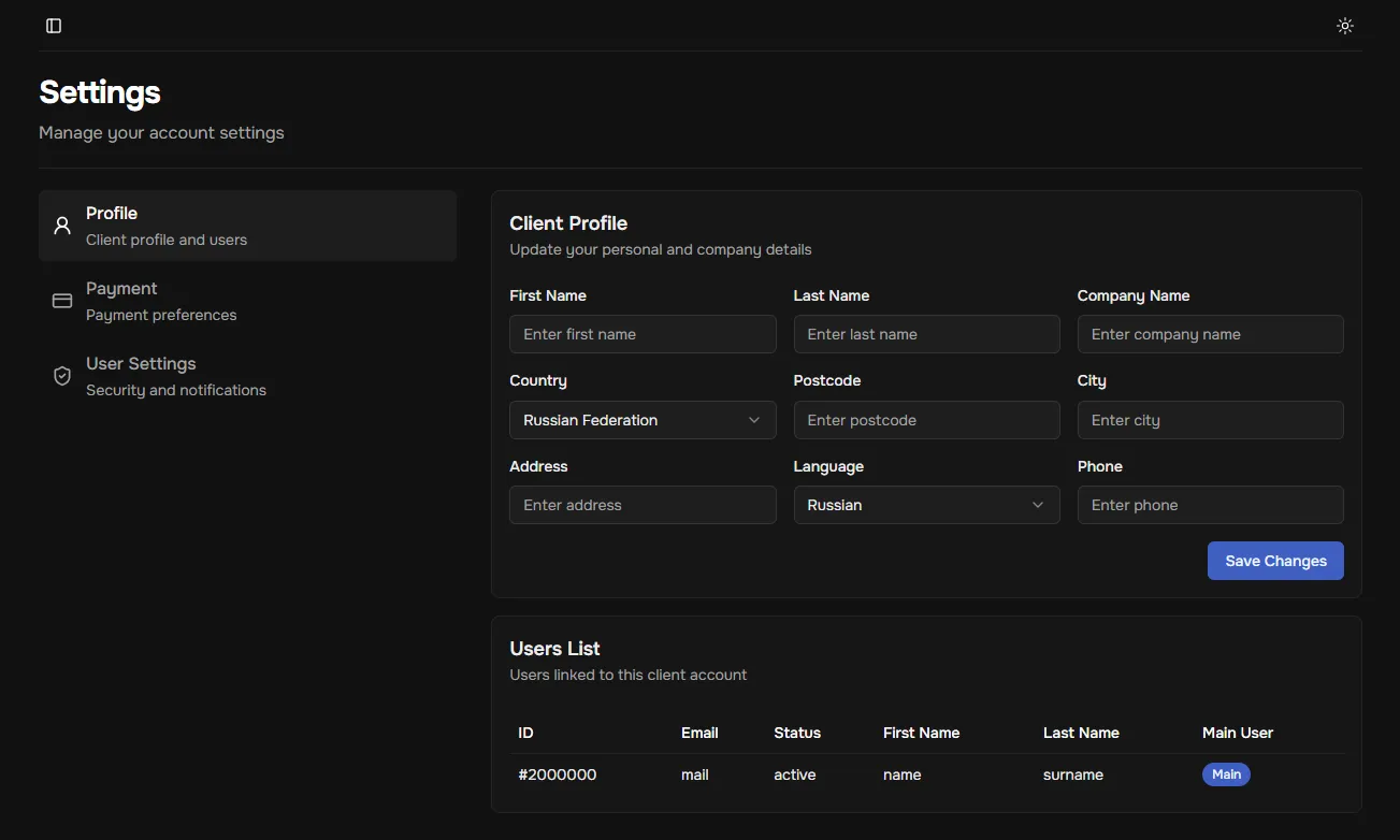 - Client users: a block with the list of users, their main information, and the status showing whether the user is the main one.