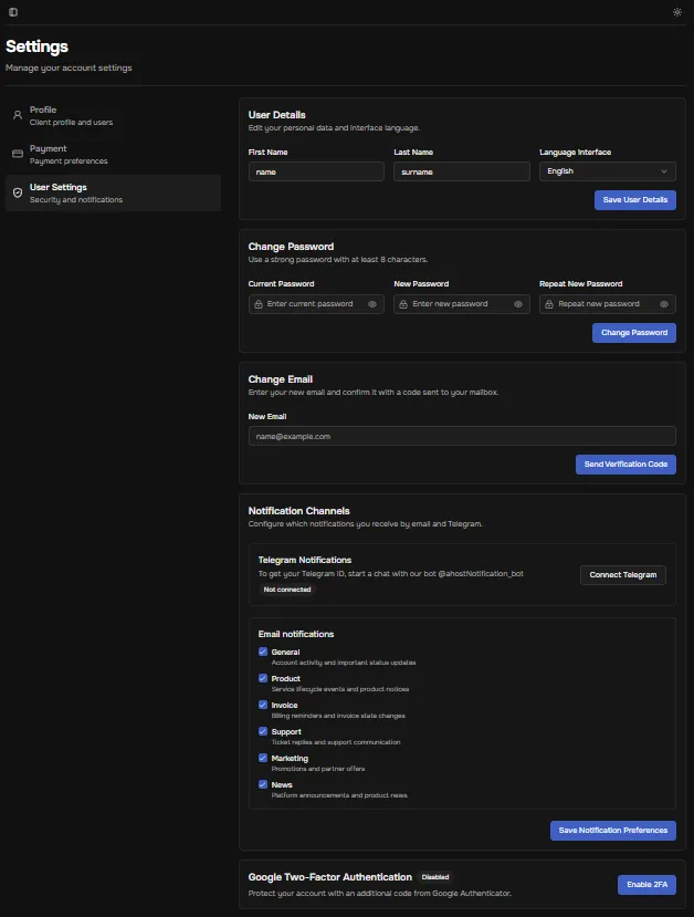 - User data: First name, Last name – enter accurate information; Language – choose your preferred billing interface language.