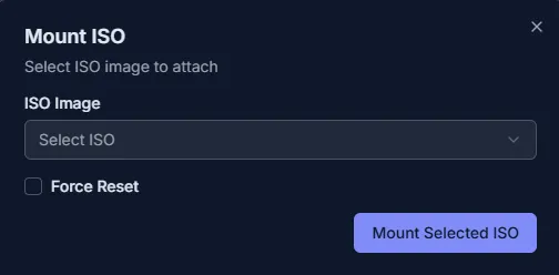 - Select an ISO image In the Mount ISO window, choose the desired ISO file from the dropdown list. Optionally, check Force Reset if you want the server to reboot and boot from the ISO.