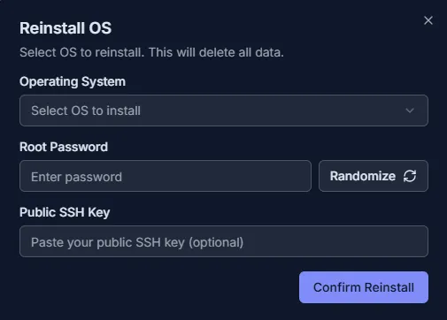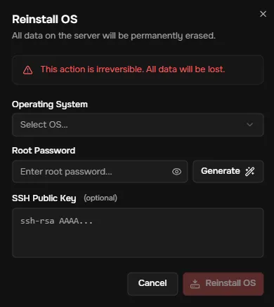 - Click the “Reinstall OS” button in the “System management” block on the “Service details” page.