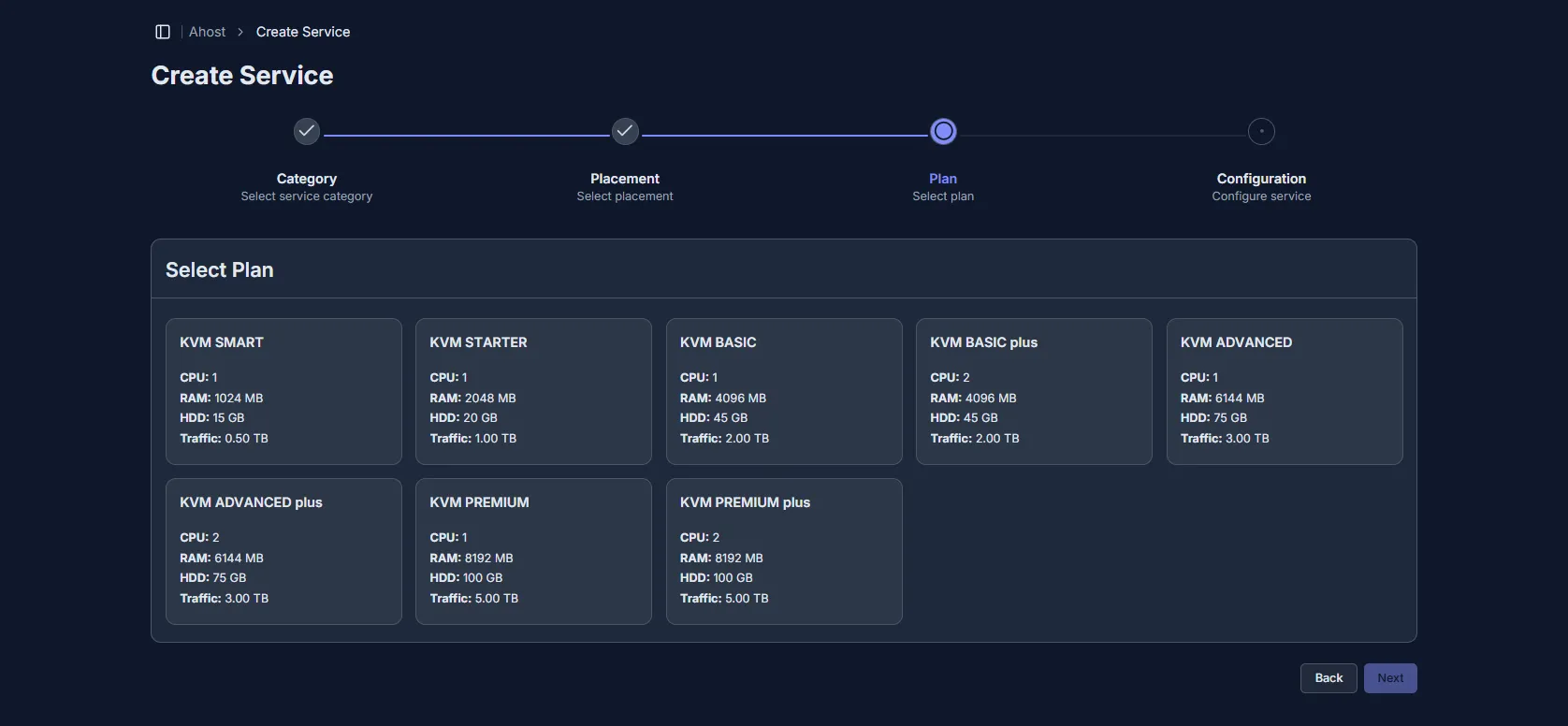 Each location and category has its own list of plans — from the most affordable to the highest-performance options on flagship hardware. When selecting a plan, focus not only on its name and position in the list but also on its description — the service specifications.