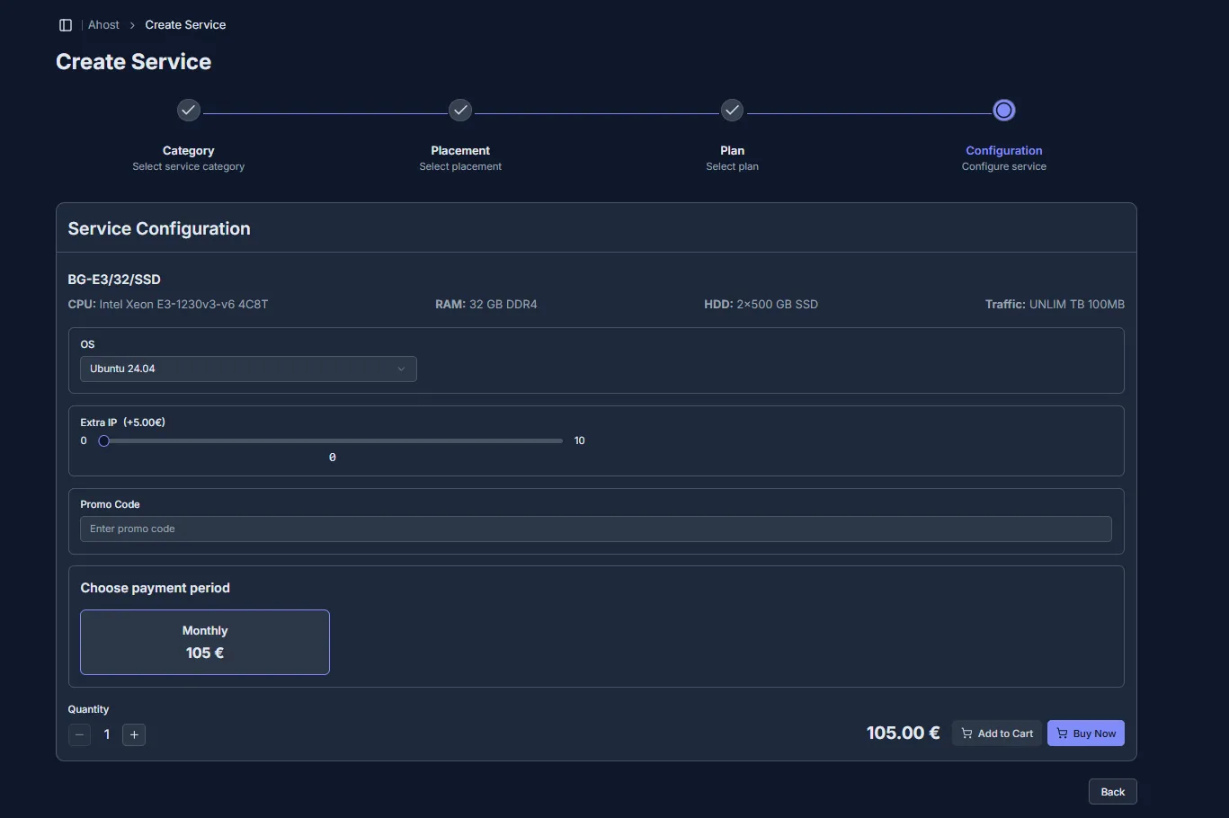 - Quantity – how many identical service units of the selected configuration will be purchased/added to the cart.
