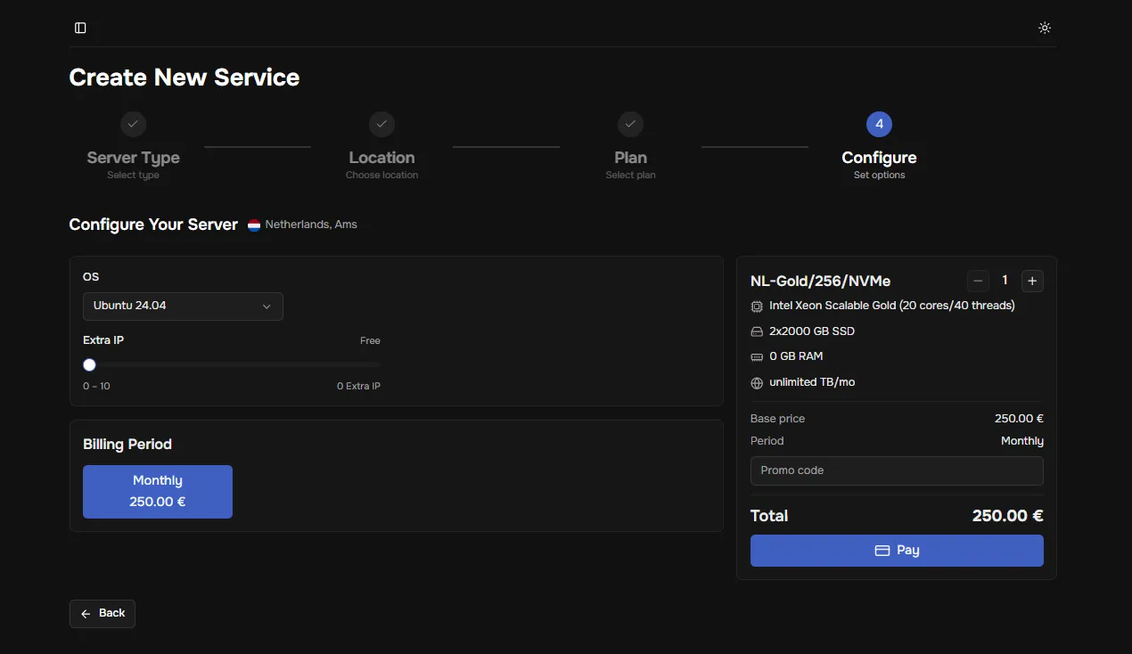 - Quantity – how many identical service units of the selected configuration will be purchased/added to the cart.