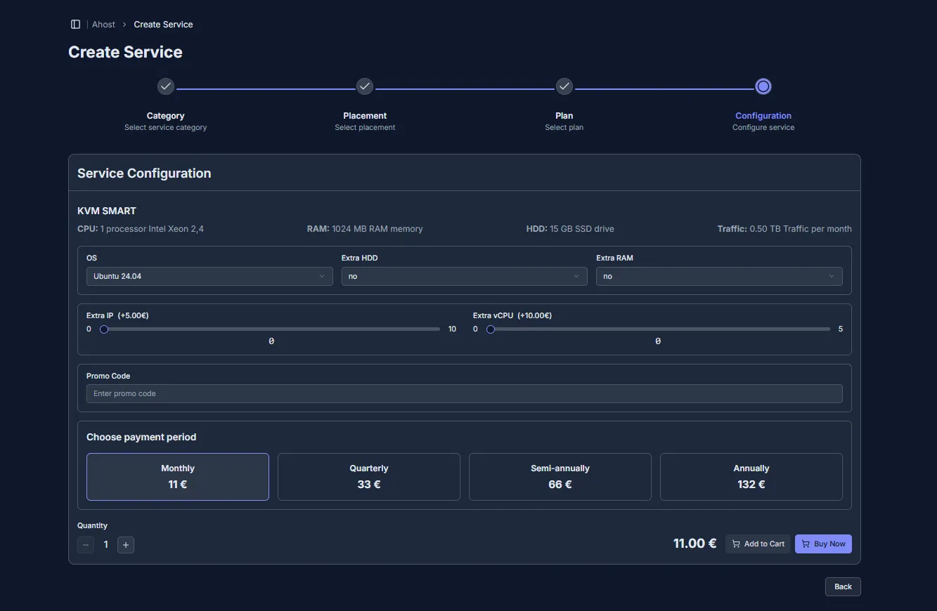 - Quantity – how many identical service units of the selected configuration will be purchased/added to the cart.