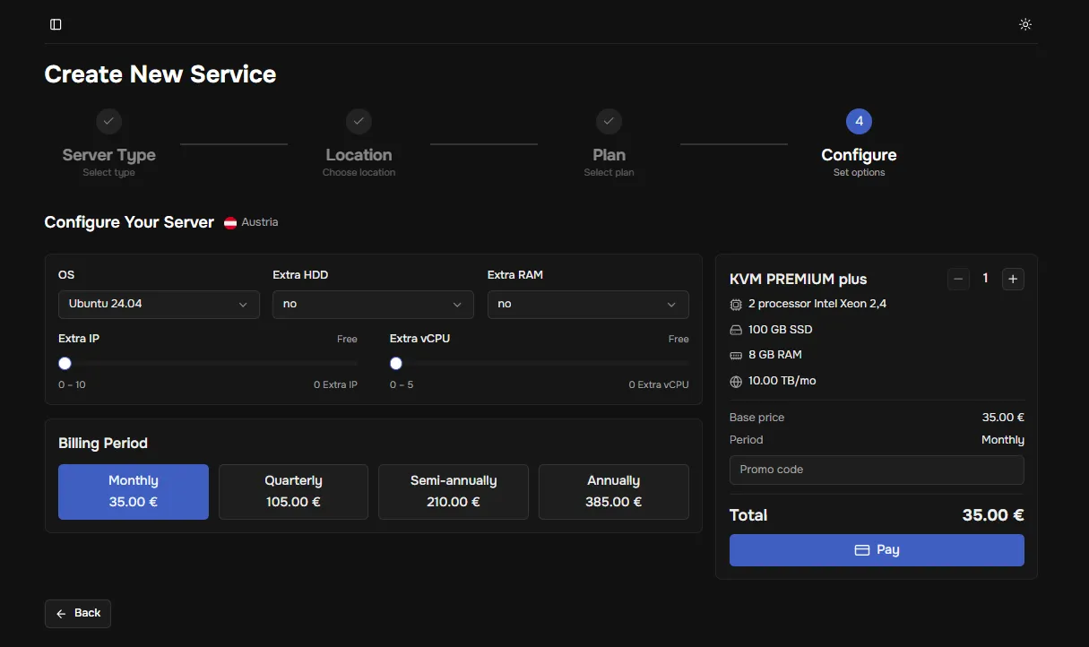 After selecting a plan (tariff), you can configure the service — choose the optimal characteristics for your tasks.